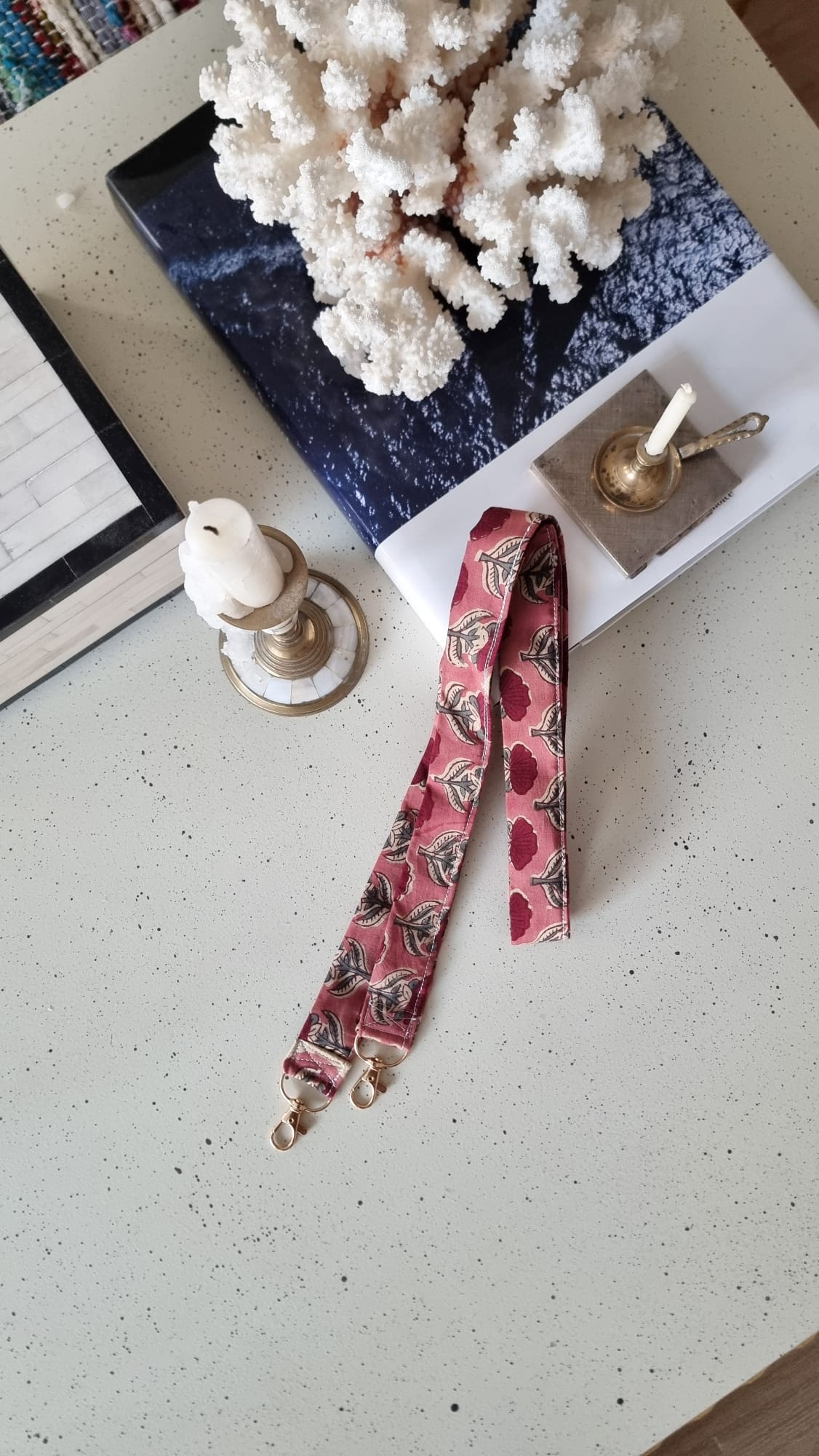 Cinta cuelga móvil en tela block print teja y burdeos.