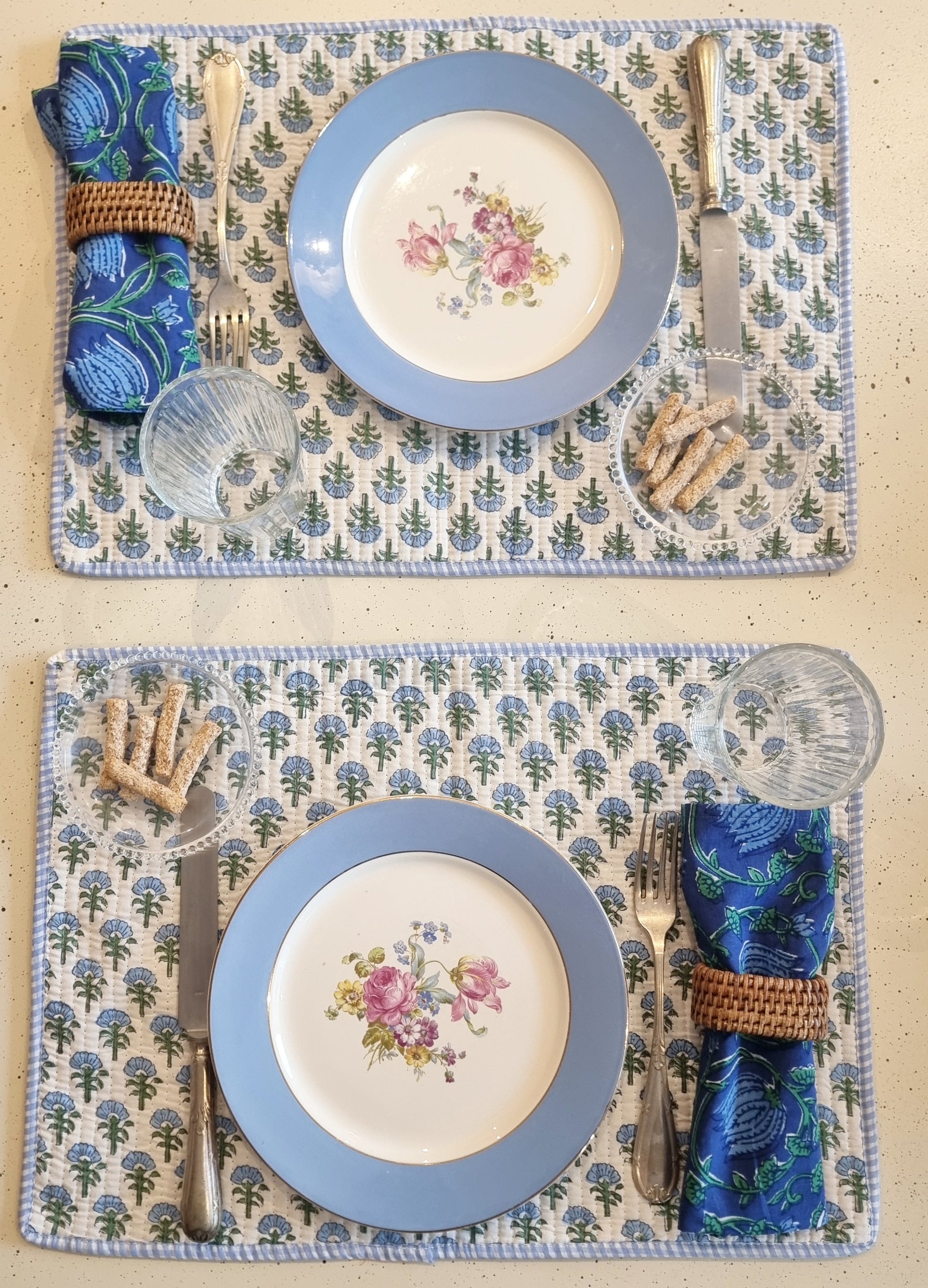 PAck de 2 manteles individuales acolchados y reversibles. Tejido de algodón 100% estampado a mano con la técnica blockprint y confeccionados también a mano.